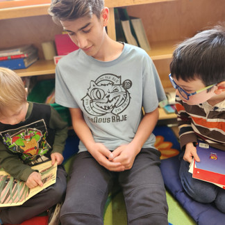 Une fois par mois, les élèves du cours de religion de Mme Amy viennent faire de la lecture avec nous. Ils sont toujours impressionnés par nos progrès.